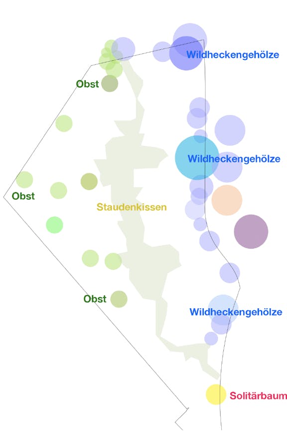 Die Gestaltung setzt auf minimale Versiegelung und nachhaltige Materialien wie wasserdurchlässige Chaussierungen. Obstgehölze aus der benachbarten Streuobstwiese wandern in den Wiesensaum und schaffen wertvolle Lebensräume für Vögel und Insekten. Das botanische Konzept mit heimischen Arten verwandelt den Außenraum in eine blühende, ökologische Insel – ein lebendiger Grünkorridor zwischen Siedlung und Natur.