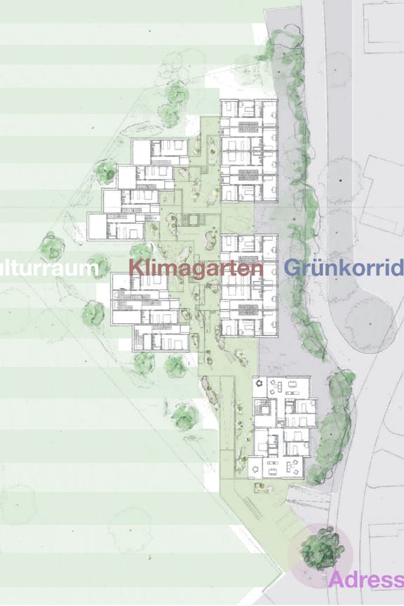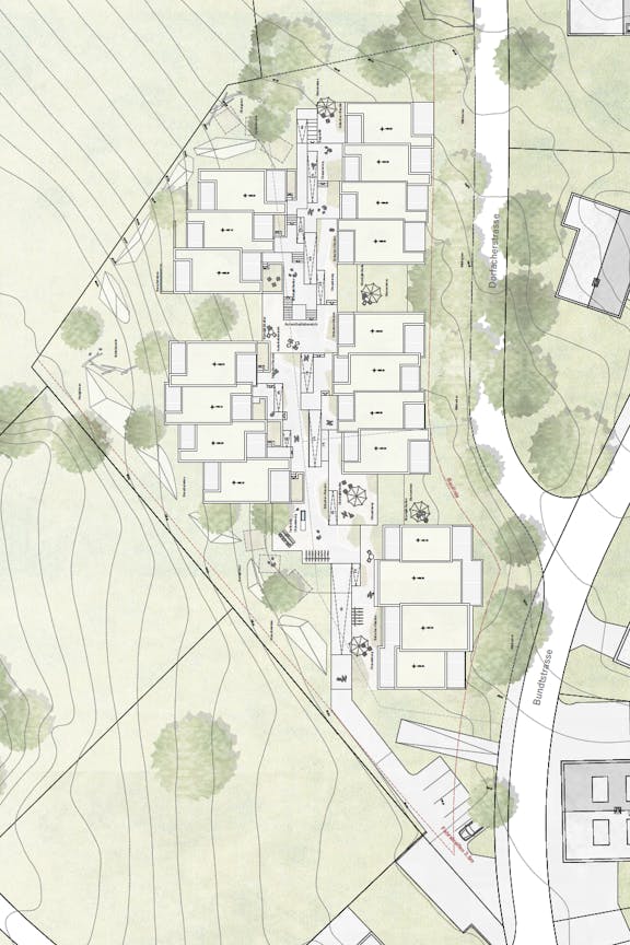 Ein zentraler Weg, der sich an der ursprünglichen Topographie orientiert, verbindet die Häuser mit Treppen und barrierefreien Rampen. Dieser Binnenraum – der Klimagarten – schafft mit üppiger Bepflanzung und vielfältigen Ausblicken eine hohe Aufenthaltsqualität. Die Freiraumgestaltung greift die kulturlandschaftliche Umgebung auf: Terrassierte Gartenräume fördern Begegnung, während Staudenkissen und Strauchgruppen entlang der Wege Struktur und Privatsphäre bieten.