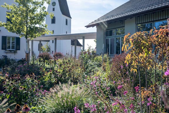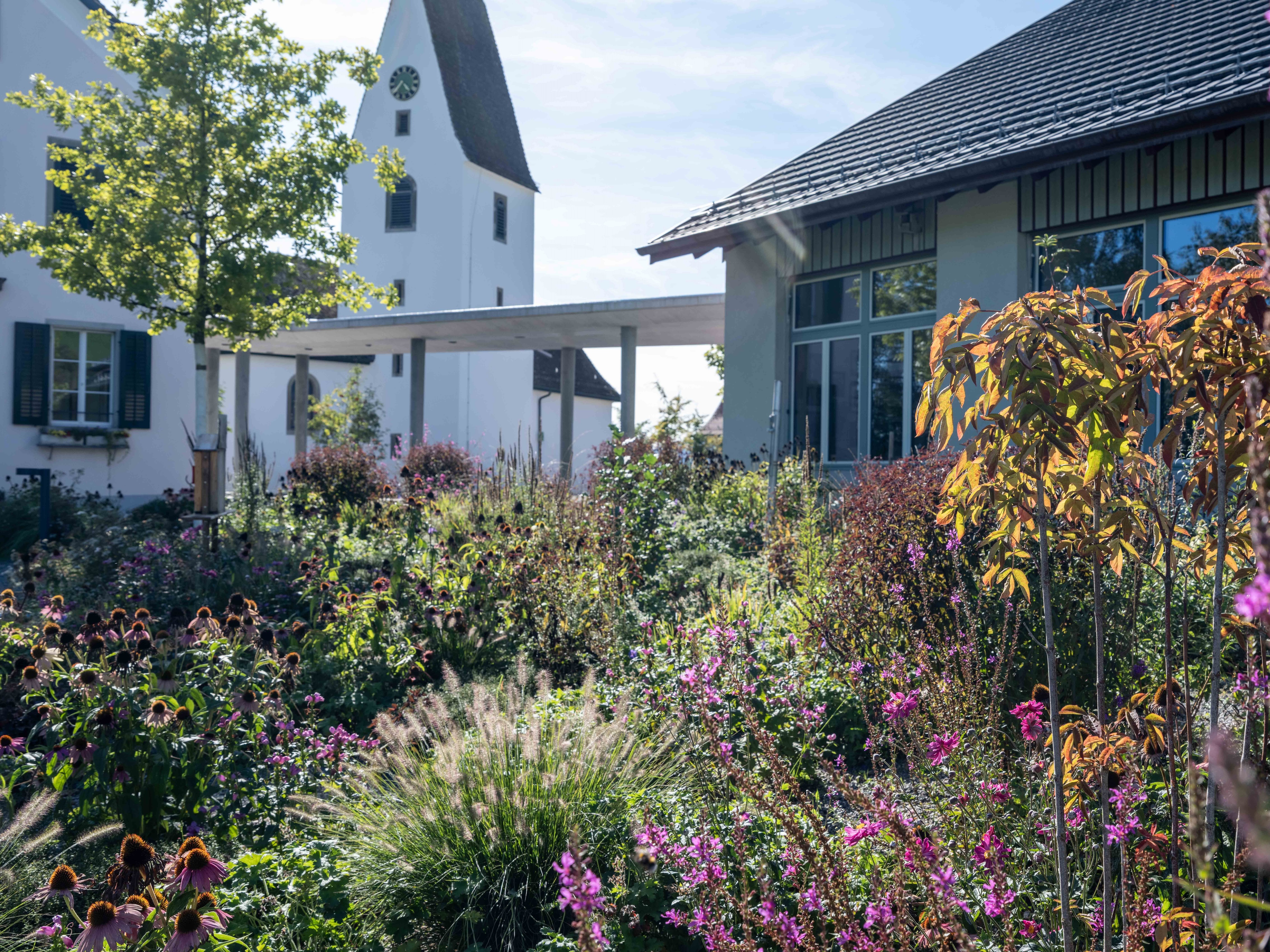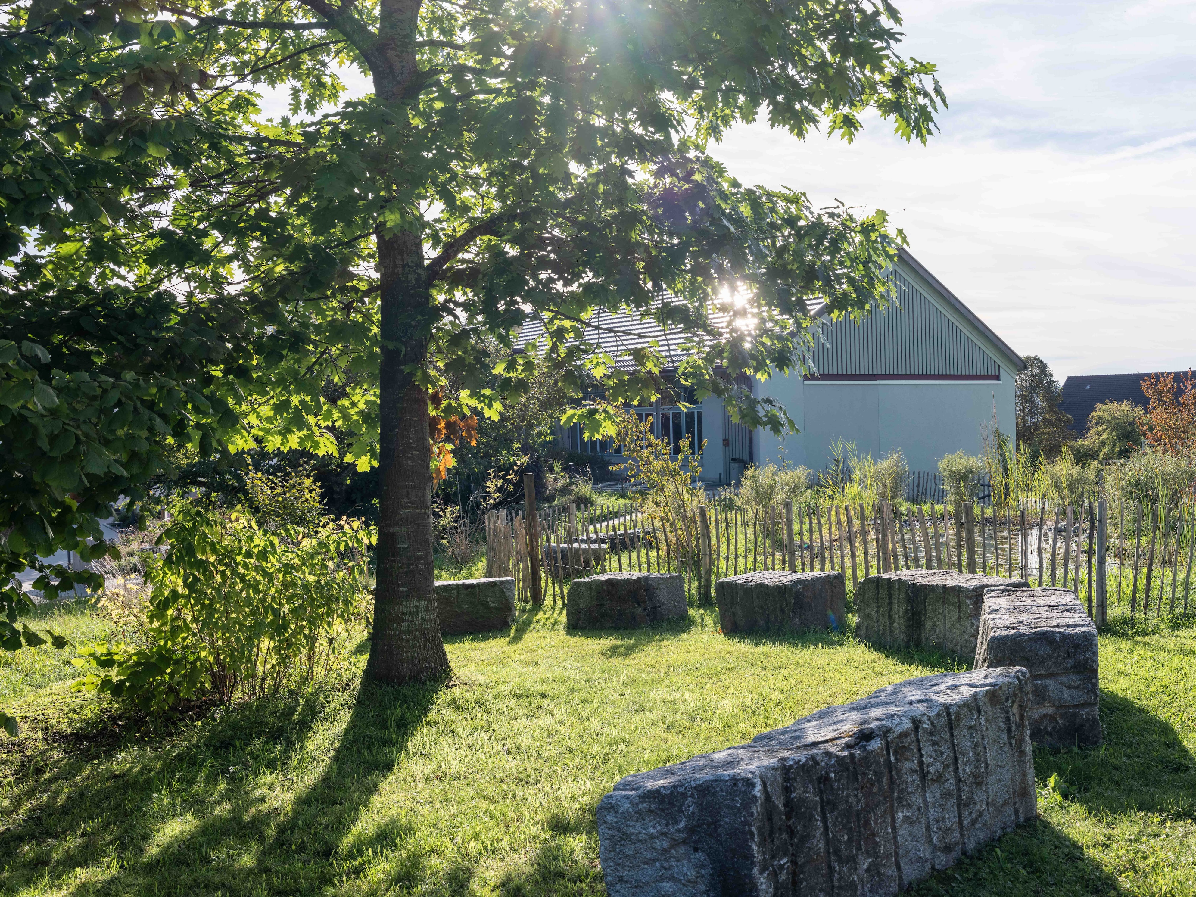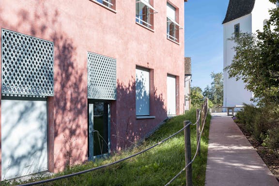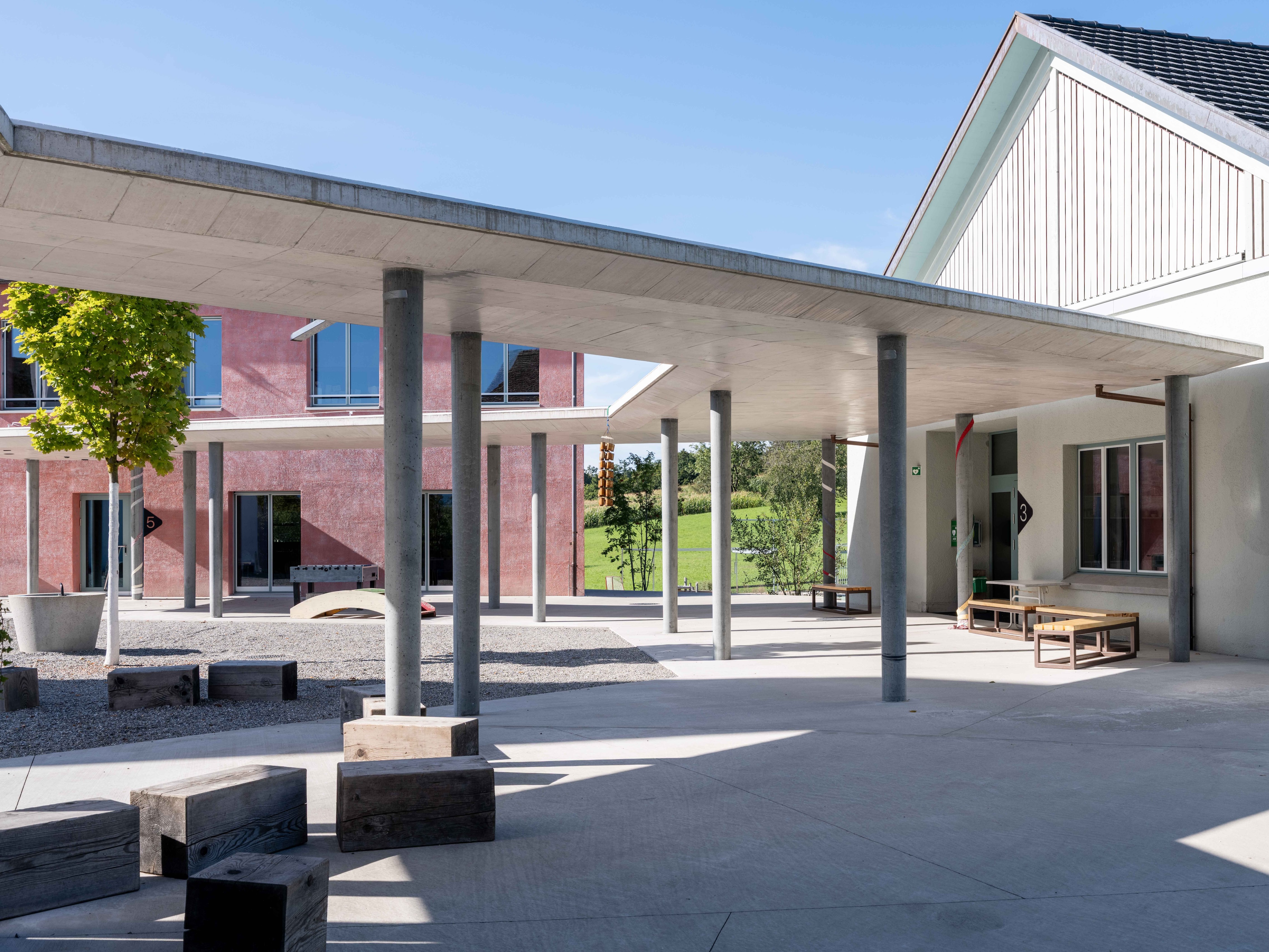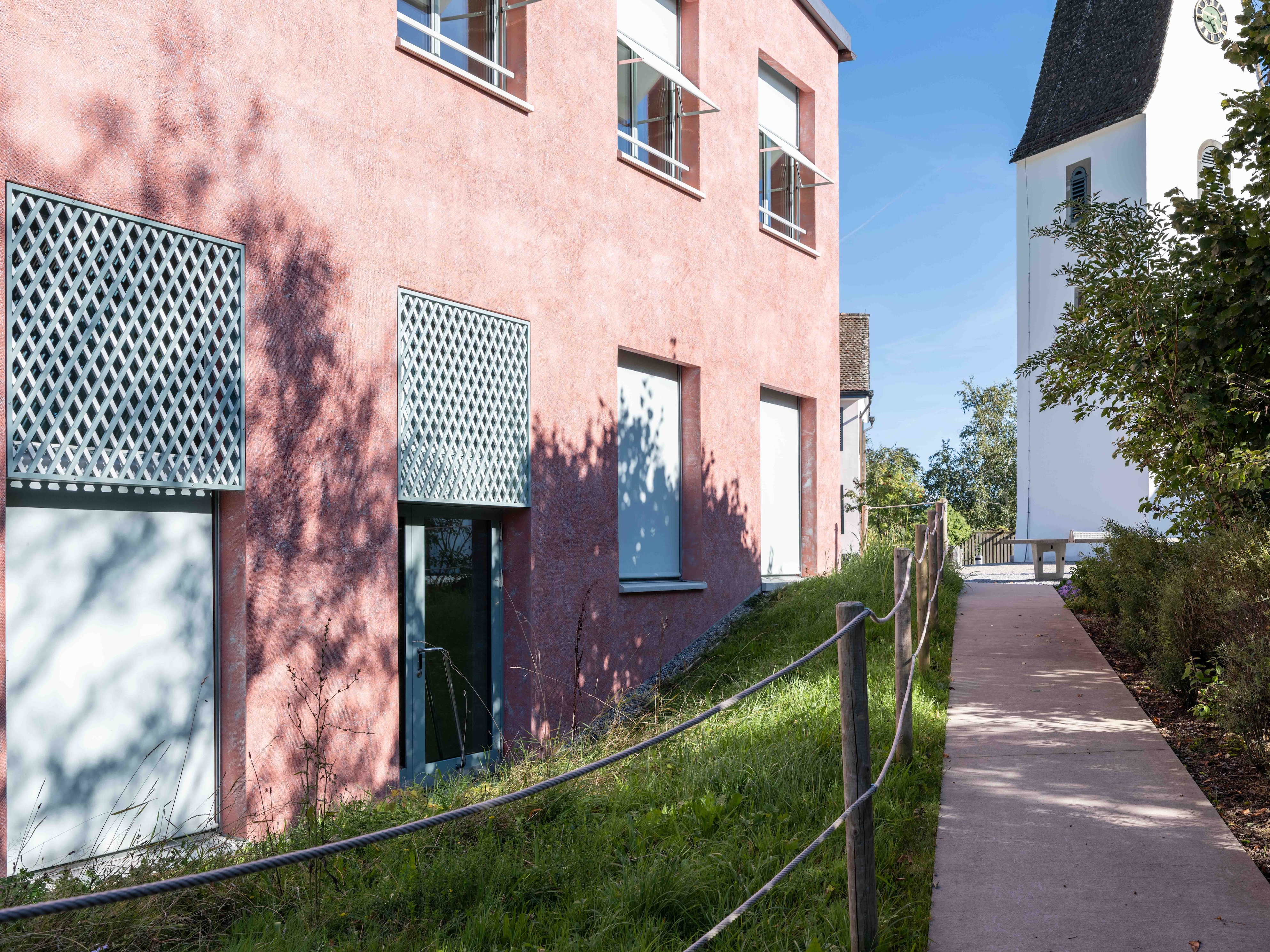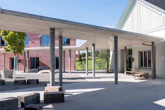 Die Erweiterung der Tagesschule setzt einen freistehenden Baukörper zum historischen Ensemble aus Kirche, Bentzelheim und Altem Schulhaus. Der Neubau grenzt den Hof ab und die Freitreppe überwindet den Geländesprung zu dem tieferliegenden Sportplatz und Garten auf natürliche Weise. Das Projekt überzeugt durch «eine sehr intelligente, präzise und spannungsvolle Setzung der Anlage.»
