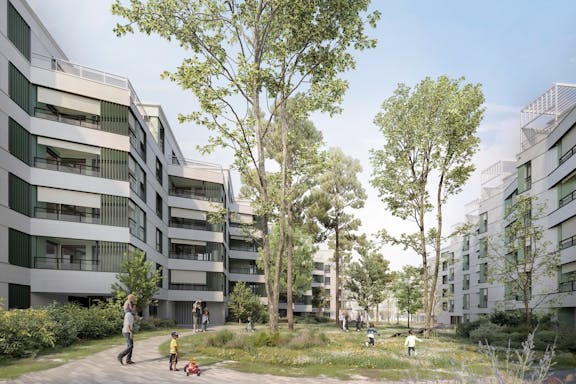 Die vorgeschlagene Überbauung fügt sich selbstverständlich in die städtebauliche Zeilenstruktur des umgebenden Bestandes ein. Sie greift die grosszügige, zusammenhängende Freiraumstruktur des Quartiers auf und stellt so den Bezug zur direkten Nachbarschaft her. Zwischen den Baukörpern spannen sich belebte Freiräume auf, welche durch eine ökologisch wertvolle Durchgrünung, ein ausgewogenes Nutzungsangebot und einen hohen Grad an Durchwegung und Durchlässigkeit geprägt sind.