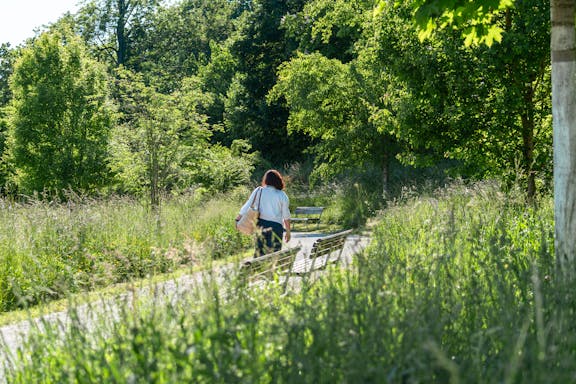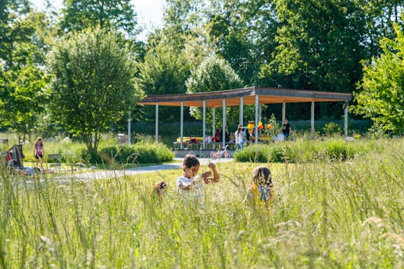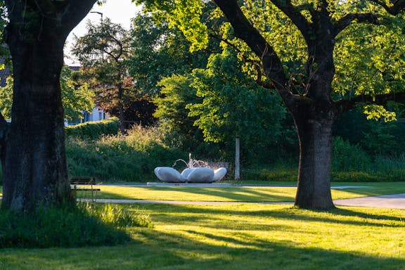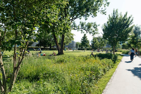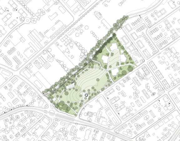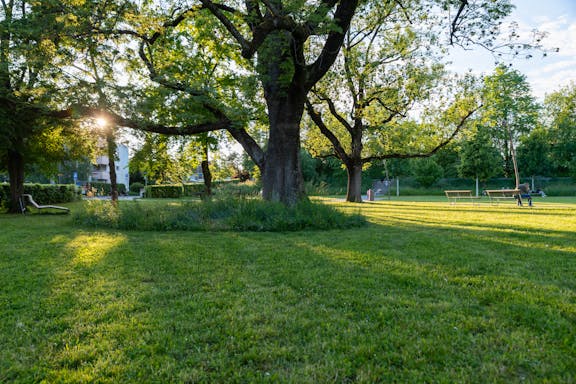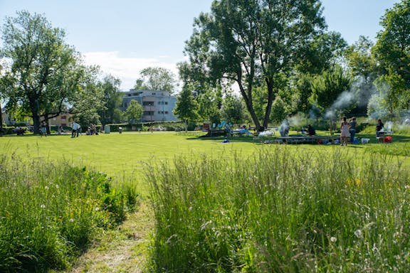 Ein unprätentiöses, unaufgeregtes Projekt, dessen Entwicklungspotential sich erst auf den zweiten Blick offenbart. Bachraum und Dammweg als abfallender Uferbereich werden neu gestaltet. Bisheriger Baumbestand und neue Bepflanzung greifen ineinander. Wegeführung und Bäume formen zwei unterschiedlich grosse Parkwiesen. Der Verkehrsraum der Baslerstrasse erscheint weit weg.