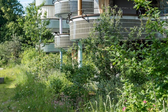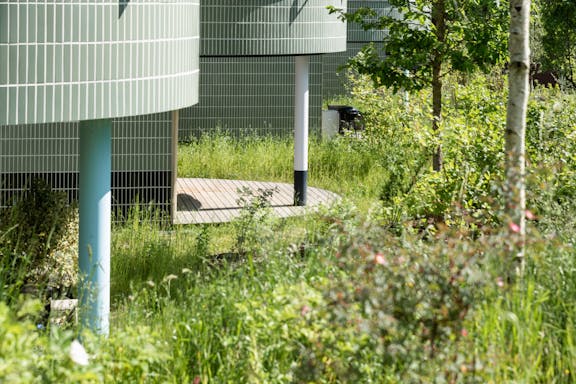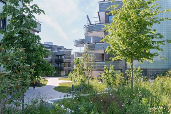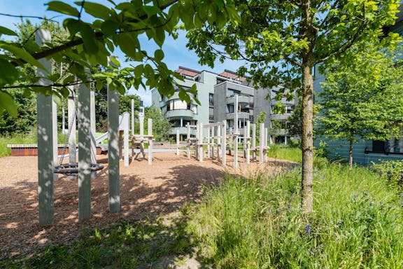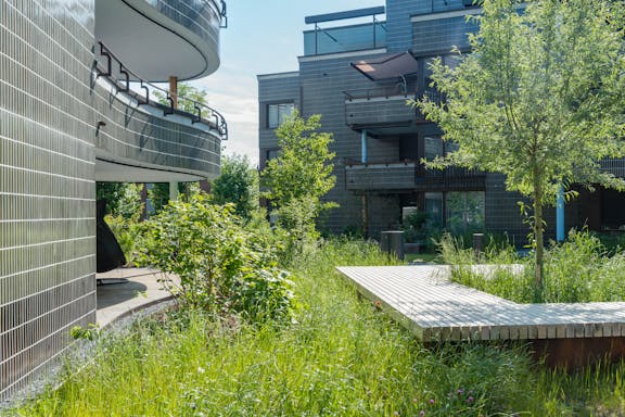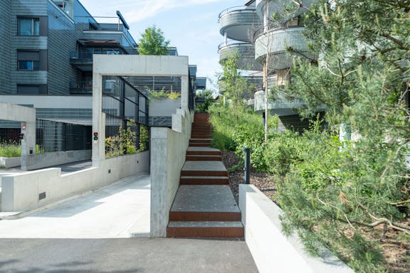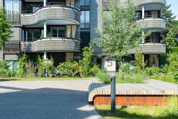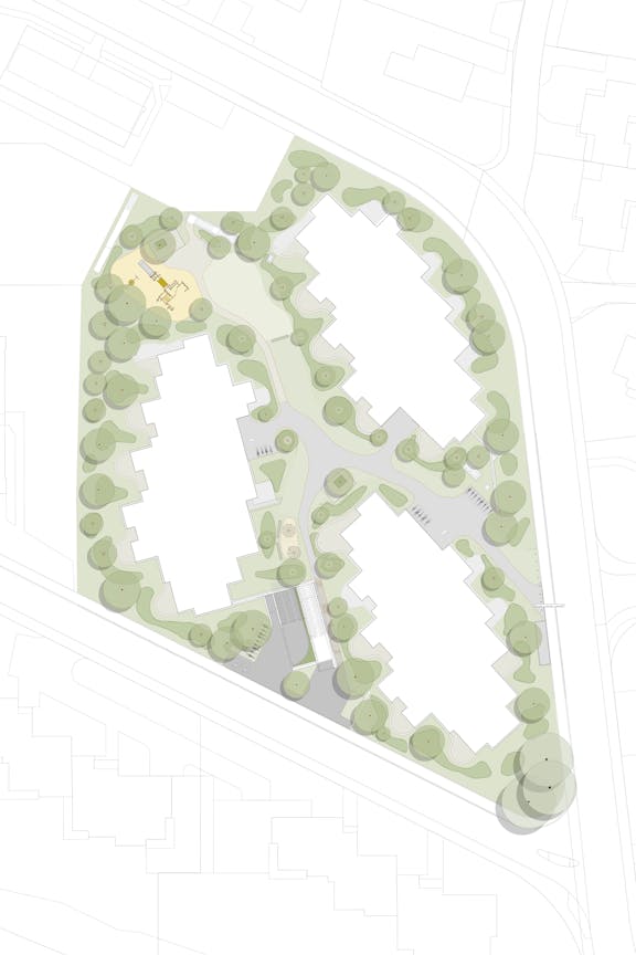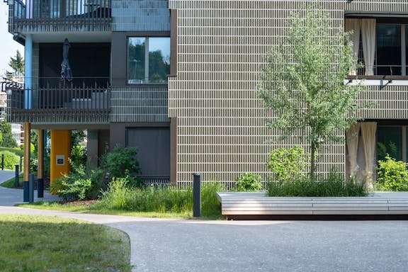 Das neue Ensemble aus drei Gebäudekörpern folgt dem Hangverlauf der Alten Landstrasse und fügt sich harmonisch in das Ortsbild ein. Die Volumen verdichten sich nach innen, während sie zur Umgebung hin zurückweichen und sich in die Landschaft einfügen. Im Zentrum entsteht ein attraktiver gemeinschaftlicher Freiraum, der durch die präzise Anordnung der Gebäude den Grünraum zur Geltung bringt. Die informelle Bepflanzung mit einheimischen Gehölzen wie integriert die Bebauung in die ländliche Umgebung. Im Innenbereich zwischen den Gebäuden sind Obstbäume wie Äpfel, Birnen und Zwetschgen gepflanzt, die den Bezug zur Kulturlandschaft betonen. Blütenreiche Sträucher rahmen die Terrassen, bunte Wiesen mit Wildblumen und Wildgräsern fördern die Biodiversität. Die großzügigen Freiflächen im Inneren des Ensembles bieten Raum für Begegnung, Aufenthalt und Spiel.